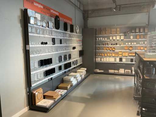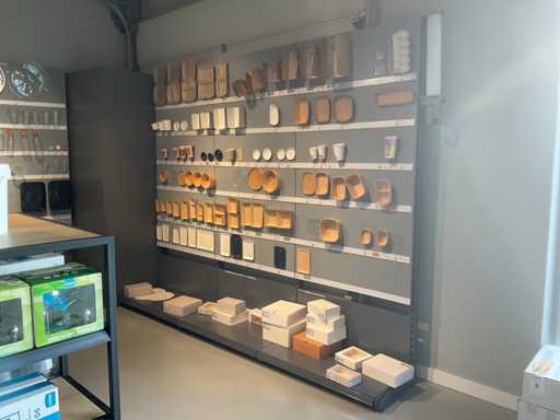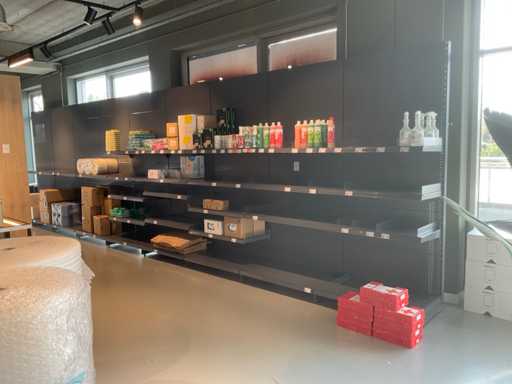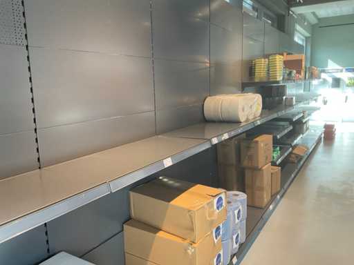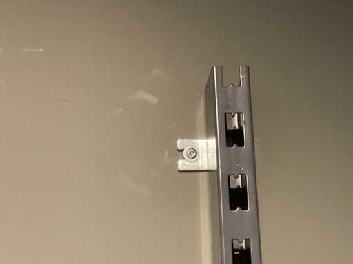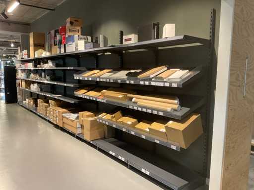 3 étagères murales dans différentes configurations, taille par étagère d’environ 100x45 cm, montants en forme de L de 39 hauteur 244, environ 80 étagères et divers accessoires tels que séparateurs, porte-étiquettes de prix, etc., y compris des étagères mobiles et des supports dans les entrepôts jetables sur 1 rack.