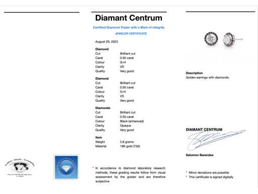 noirs Diamant : naturel ; Quantité : 2 pièces ; Coupe : Coupe brillante ; Poids (carat) : 1,00 carat ; Couleur : G-H ; Pureté : USA ; Qualité de la coupe : Très jolie ; Diamant (secondaire) : Naturel ; Nombre de carreaux : 32 pièces ; Coupe : Coupe brillante ; Poids (carats) : 0,50 carat ; Couleur : Noir (amélioré) ; Pureté : Opaque ; Qualité de la coupe : Très jolie ; Joyau : Boucles d’oreilles ; Poids : 2,8 onces ; Matériau : or 18 carats (750) ; État : Neuf ; Emballage : Boîte à bijoux de luxe ; Explication : La qualité a été prise du rapport correspondant à l’article.