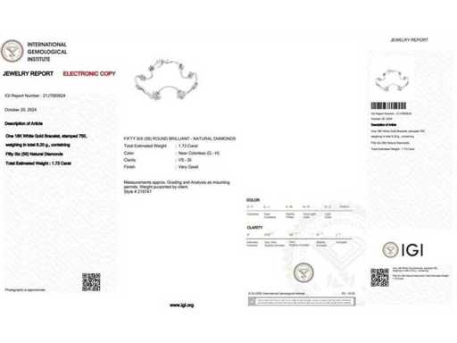 Bracelet de luxe en diamant naturel 1,73 carat en or blanc 18 carats 8,20 gr. avec 56 diamants ronds brillants naturels 1,73 carat. Couleur supérieure et pureté G-H / VS-SI. Certifié par IGI Laboratoire, l’un des plus grands instituts internationaux pour la certification et l’évaluation des diamants et des pierres précieuses. Pour plus d’informations, voir le certificat. Le vrai joyau est meilleur que les photos. Estimation du prix du détaillant : 11 250.