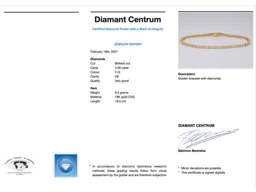 carats Diamant : Naturel ; Quantité : 71 pièces ; Coupe : Coupe brillante ; Poids (carats) : 4,00 carats ; Couleur : F-G ; Pureté : USA ; Coupe : Excellente ; Bijou : Bracelet ; Poids : 8,5 onces ; Dimensions/longueur : 17-18 cm ; Matériau : or 18K (750) ; État : Neuf ; Emballage : Boîte à bijoux de luxe ; Explication : La qualité a été prise du rapport correspondant à l’article. L’évaluation est une évaluation d’un négociant certifié en diamants, basée sur les prix à la consommation ; Prix à la consommation : 21 000 €