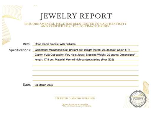 brillants Pierre précieuse : moissanite ; Coupe : Coupe brillante ; Poids (carat) : 26,00 carats ; Couleur : E-F ; Pureté : VVS ; Qualité de la coupe : Très jolie ; Bijou : Bracelet ; Marque : Harmony ; Poids : 20 grammes ; Dimensions/longueur : 17,5 cm ; Matériau : Vermeil en argent sterling de haute qualité (925) ; État : Neuf ; Emballage : boîte à bijoux ou étui en velours ; Explication : La qualité a été prise du rapport correspondant à l’article. L’évaluation est une évaluation d’un négociant certifié en diamants, basée sur les prix à la consommation ; Informations supplémentaires : Le poids mesuré des pierres précieuses est basé sur la taille des diamants ; Prix grand public : 2 000 €