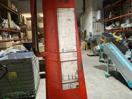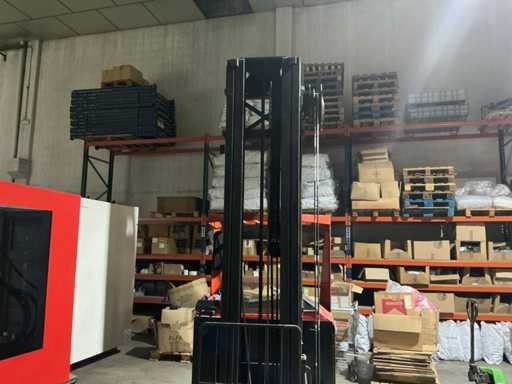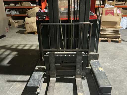 Équipé d’une console de commande multi-leviers, fourches réglables, protection avant, chargeur de batterie, double mât, fourchette rotative, levier de vitesses latérales ; distance entre les fourches palette d’environ 350 mm.