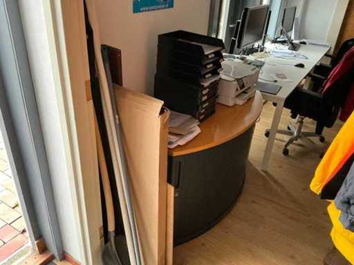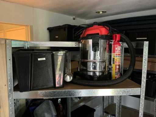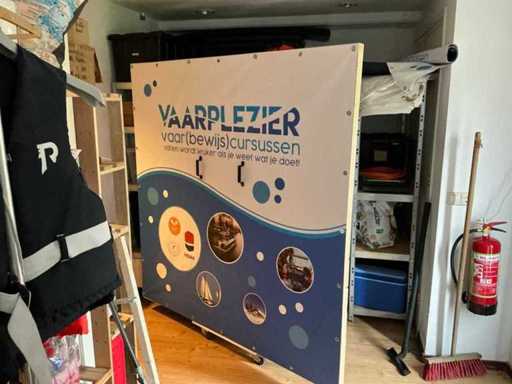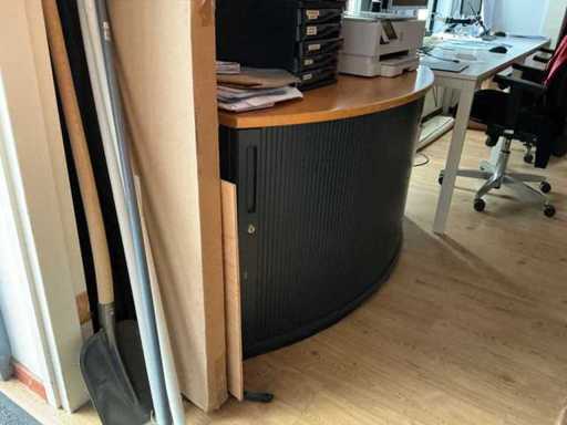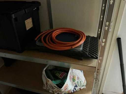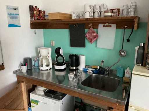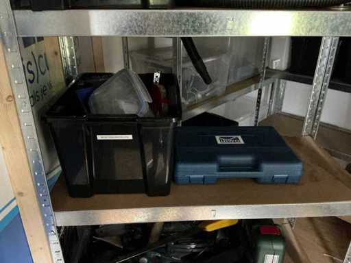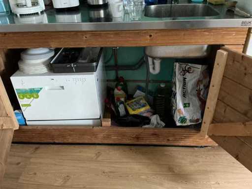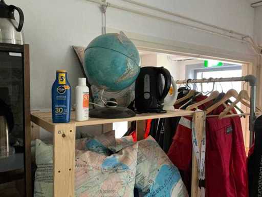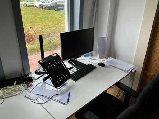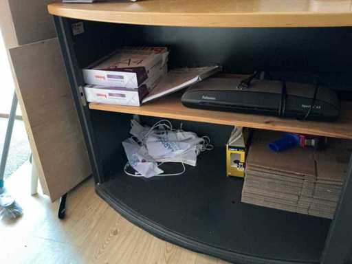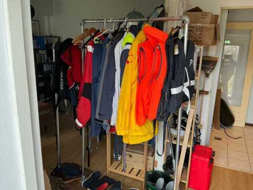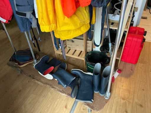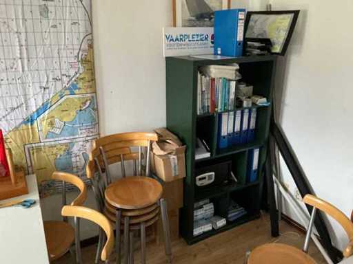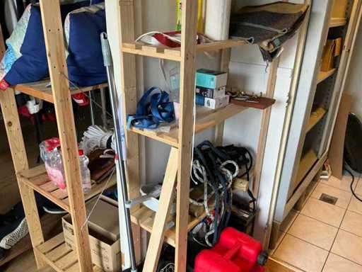 Composé de 3 étagères avec contenu (outils, accessoires pour sports nautiques, articles de nettoyage, etc.), 1 classeur 120x45x195cm, menottes, table de bureau avec chaises, classeur semi-circulaire, console sur trépied, 1 table de conférence avec chaises, lave-vaisselle Etna, divers équipements de cuisine, meuble de rangement avec divers fournitures de bureau, porte-linge avec vêtements pour sports nautiques, imprimante, etc