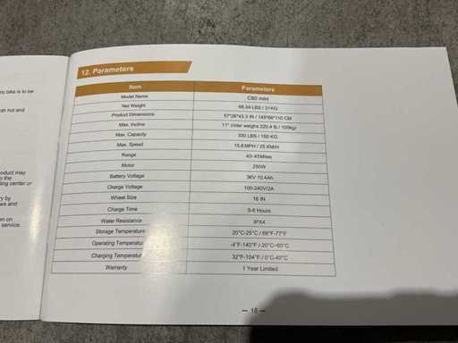 équipé de Drive : Électrique avec assistance au pédalier ; Puissance moteur : 250 W ; Type de moteur : Moteur électrique sans balais ; Vitesse maximale supportée : 25 km/h ; Transmission : moteur arrière ; Batterie : 36V lithium-ion ; Capacité de la batterie : 10,4 Ah ; Tension de charge : 100–240 V / 2A ; Taille des roues : 16 pouces ; Poids de transport : 39 kg ; Inutilisés dans la boîte