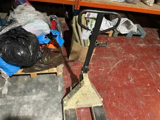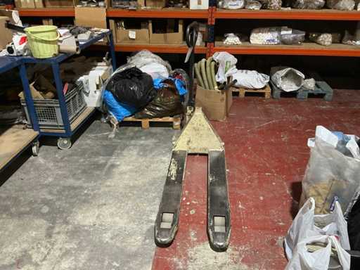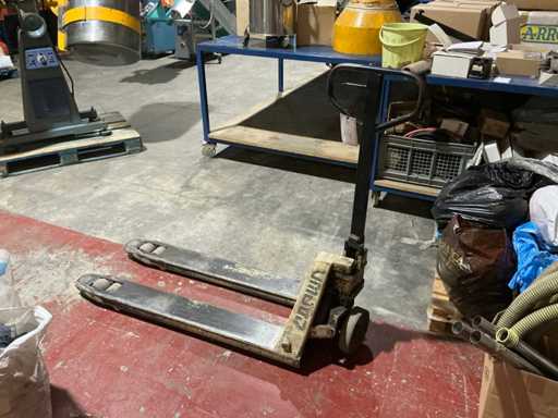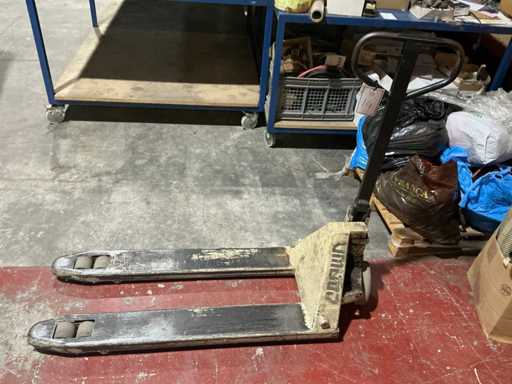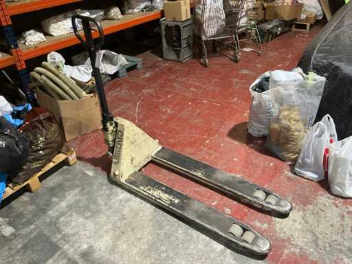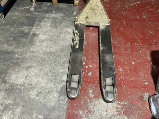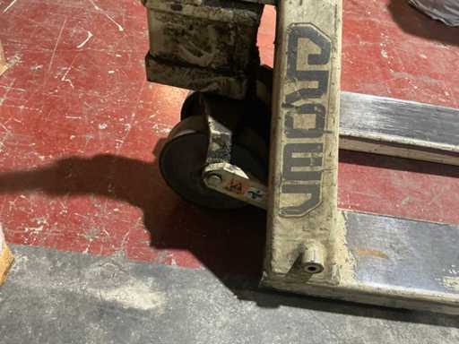 manuelCamion à palettes hydrauliques manuelles CROWN pour la manipulation de palettes et de conteneurs dans les entrepôts ou les zones de production, avec deux rouleaux aux extrémités de la fourche.