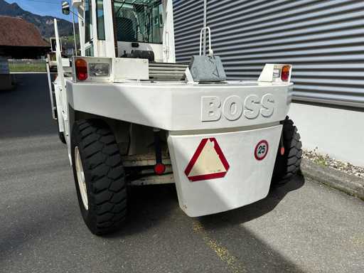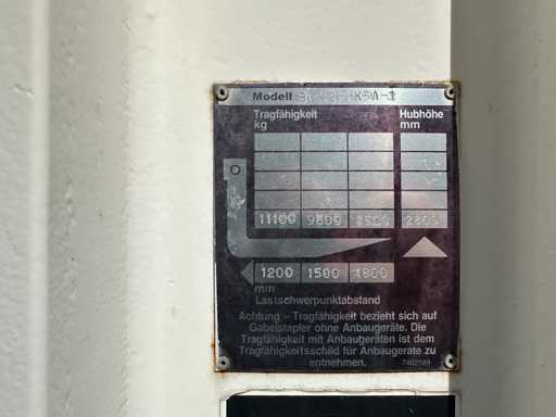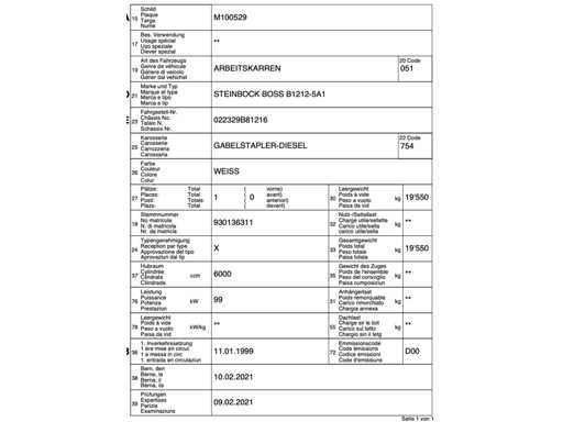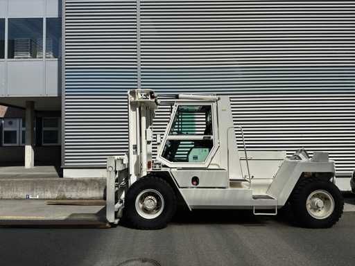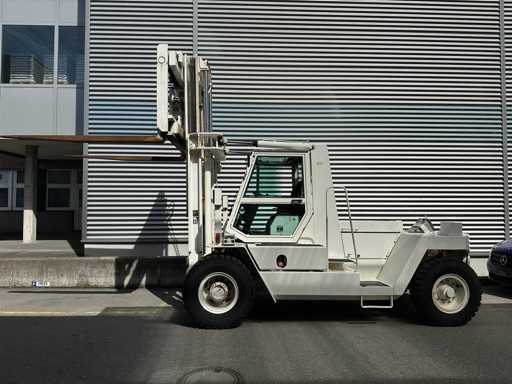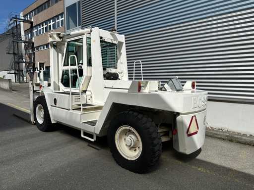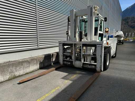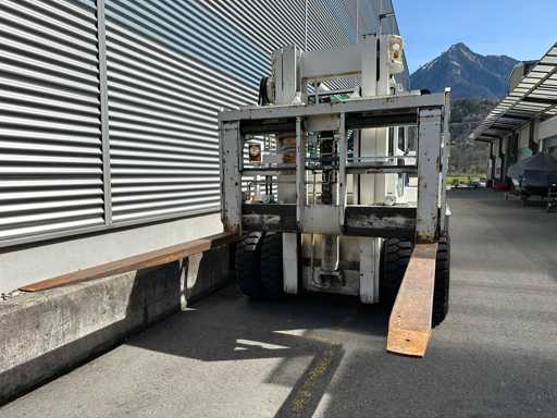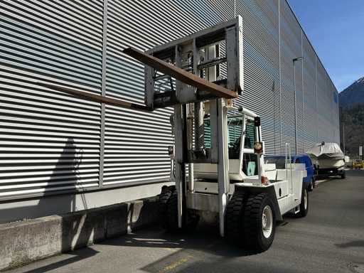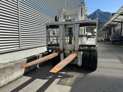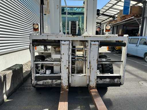 Chariot élévateur super puissant pour chaque application Très bon état. Le transport à travers la Suisse est possible en camion !! -Automate - Freins à air comprimé - Idéal pour les conteneurs - Décalage latéral, réglage de fourche - Service maintenu - Moteur très puissant et fiable -Non-fumeur - Ancienne armée de Suisse - Portes : 2 - Places : 1 - Couleur extérieure : blanc (doit être repeint partiellement) - Équipements supplémentaires : verrouillage du différentiel, système hydraulique DÉTAILS TECHNIQUES Type : Duplex Hauteur de levage : 2 800 mm Levage libre : 1 500 mm Capacité de charge : 12 000 kg Centre de gravité de charge : 1 200 mm Fourchettes Longueur : 2 400 mm Largeur : 200 mm Épaisseur : 100 mm Largeur du chapeau de fourche : 2 500 mm Type de transmission Moteur : Diesel Perkins DÉTAILS DE LA MACHINE Poids net : 20 000 kg Longueur : 5 400 mm Largeur : 2 650 mm Hauteur : 3 050 mm Hauteur du mât : 3 150 mm Heures d’ouverture : 1 385 h Pneu Type : Pneu pneumatique Taille : 12,00-20 ÉQUIPEMENT - Décalage latéral - Positionneur de fourche : 1 100 mm - 2 350 mm -Chauffage