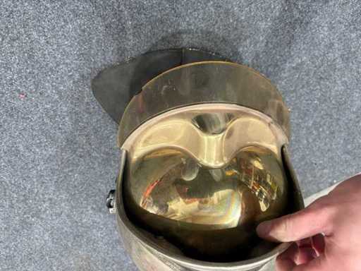 - Visière en métal chromé ou en plastique, plaquée or, doublée de sangles en cuir et de mailles