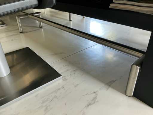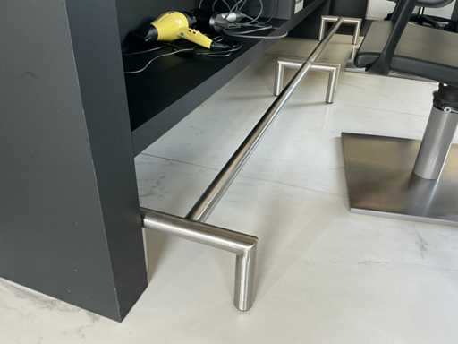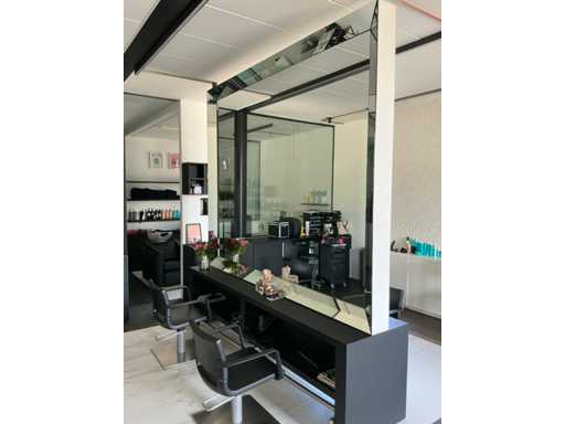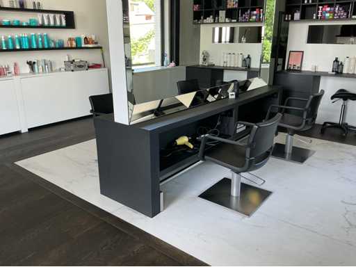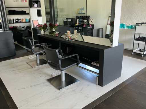 Mur de miroir sur table de travail avec des dommages mineurs au miroir en bas à gauche, 2X repose-pieds en acier inoxydable et 4 chaises de salon de coiffure de la marque Greiner. A démonter soigneusement par l’acheteur sans abîmer l’intérieur ! Contenu / produits non inclus !