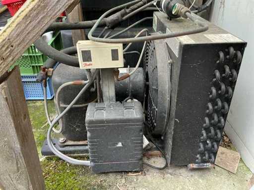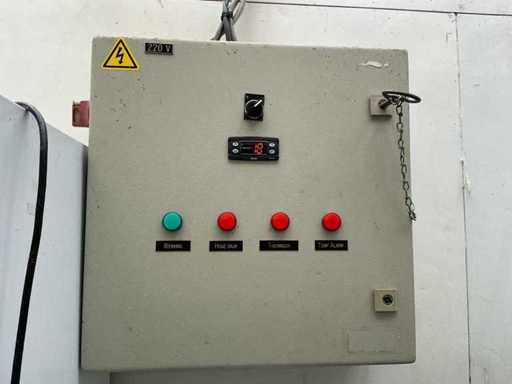 L’installation dispose d’un évaporateur industriel (MCL 48) et d’une unité de réfrigération (CAJ 4517 ZHR), contrôlés via une boîte de contrôle transparente avec des indicateurs numériques de contrôle et de contrôle de température (haute pression, thermique, alarme de température).