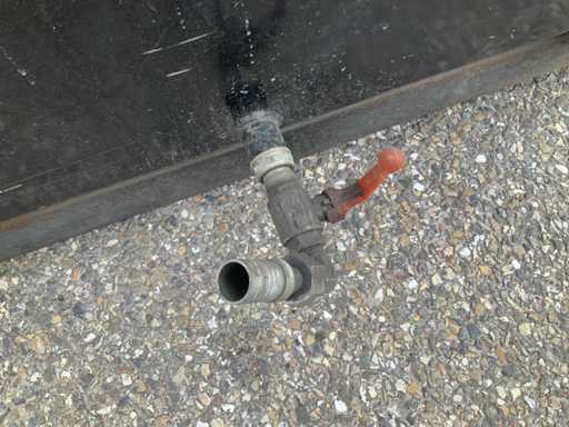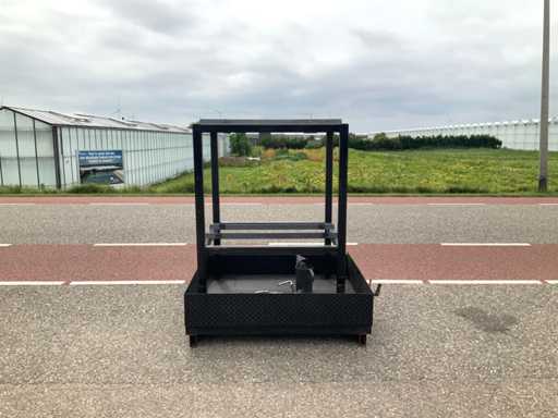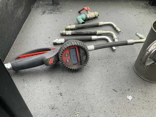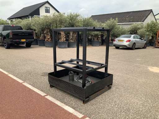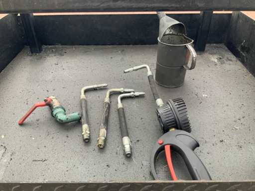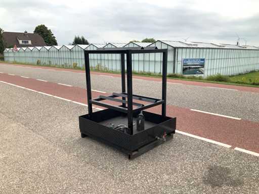 Avec un rack pour deux fûts à huile, avec divers accessoires et un compte-litres.