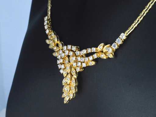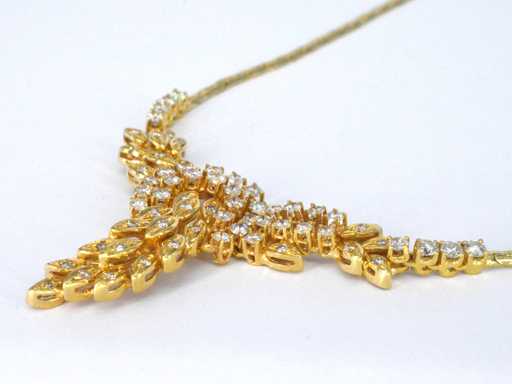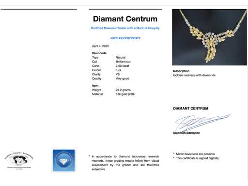 qualité Diamant : naturel ; Quantité : 65 pièces ; Coupe : Coupe brillante ; Poids (carat) : 2,50 carats ; Couleur : F-G ; Pureté : USA ; Qualité de la coupe : Très jolie ; Joyau : Collier ; Poids : 23,2 grammes ; Dimensions/longueur : 41 cm ; Matériau : or 18K (750) ; État : Comme neuf ; Emballage : Boîte à bijoux de luxe ; Explication : La qualité a été prise du rapport correspondant à l’article. L’évaluation est une évaluation d’un négociant certifié en diamants, basée sur les prix à la consommation ; Prix à la consommation : 20 930 €