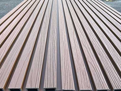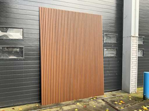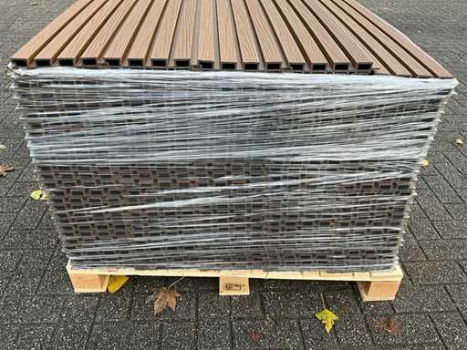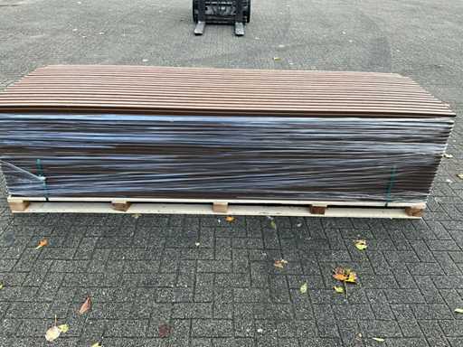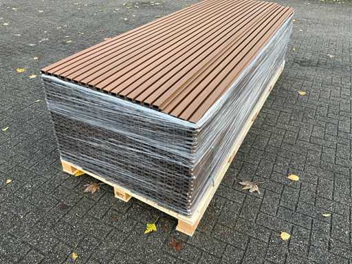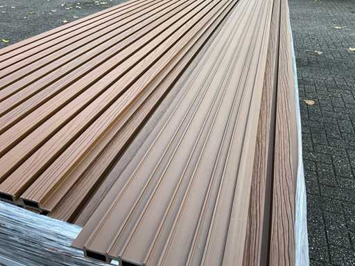 100 panneaux de 290 x 21,9 cm, largeur de travail ; 20cm, couleur ; teck, équipé de Co-extrusion, d’une durée de vie extra longue et d’une rétention de couleur, 100 panneaux représentent environ une surface de travail de 58 m2.