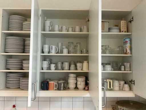 Composé de 2 pièces de machine de trempe ASMC, un micro-ondes Samsung, un réfrigérateur Zanussi, un barbecue de contact Tefal, de la vaisselle, des couverts, de la verrerie, etc.