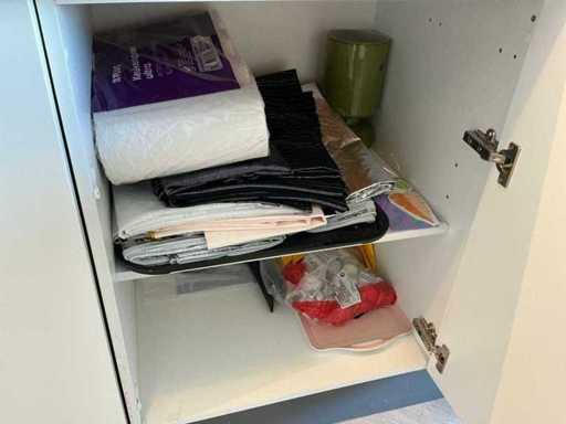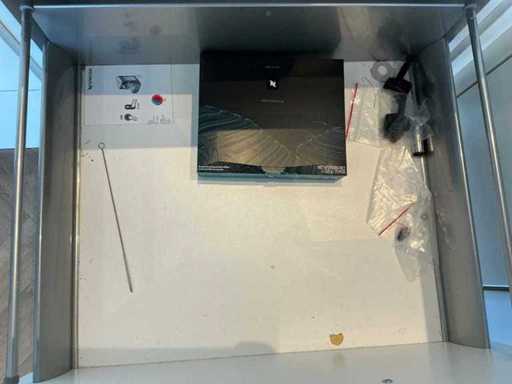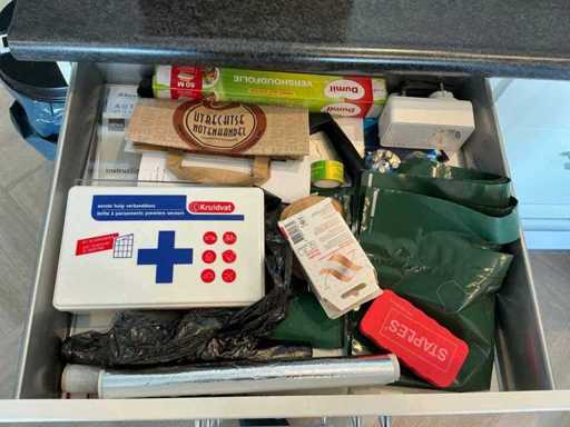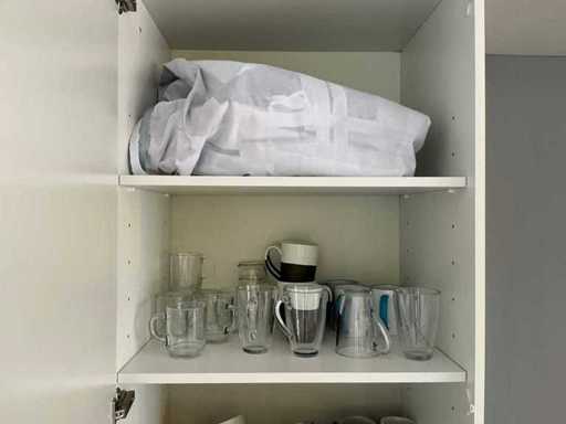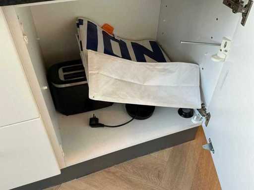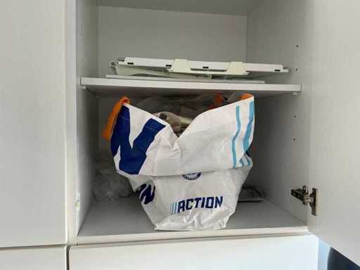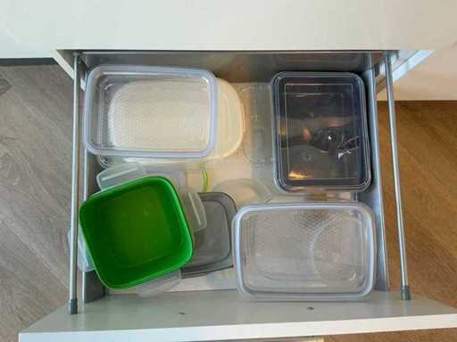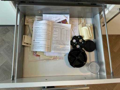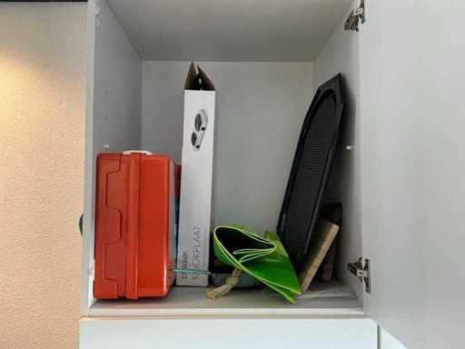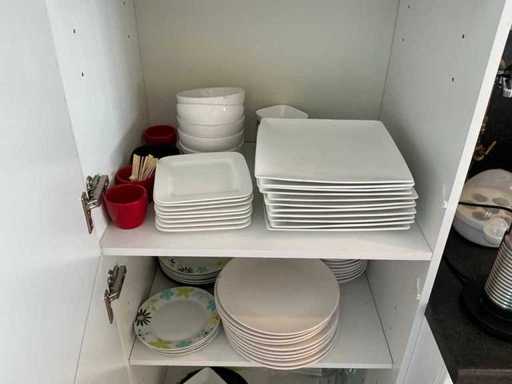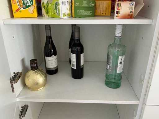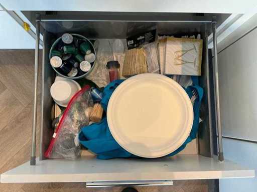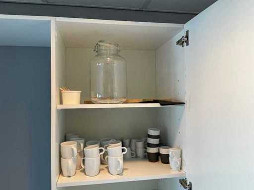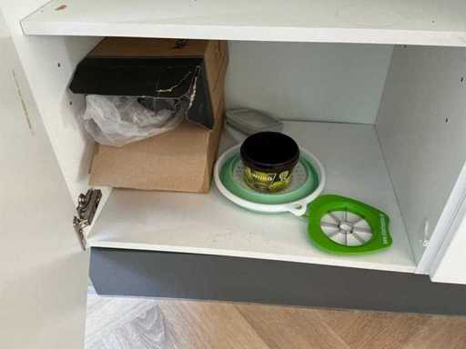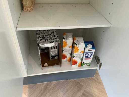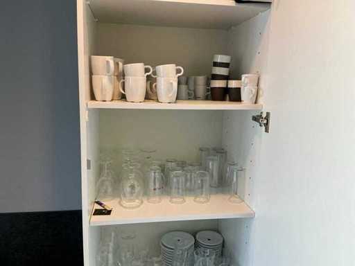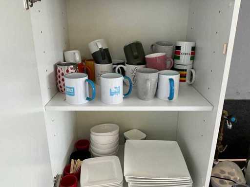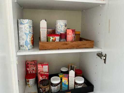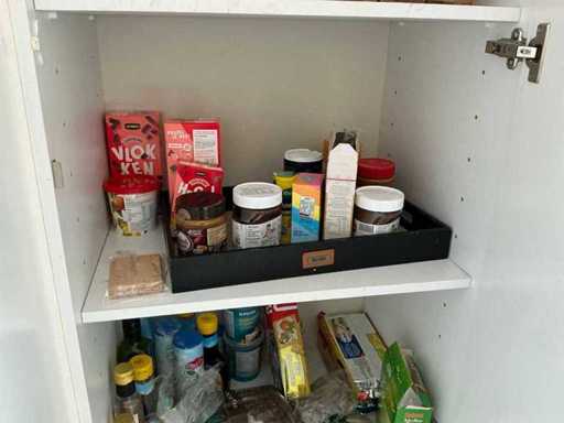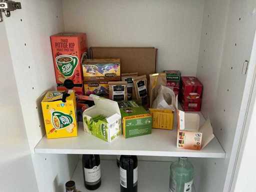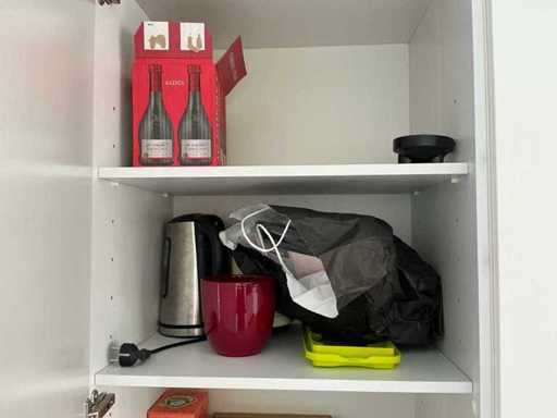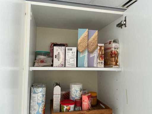 Composé de machine à café Nespresso, de cuits à œufs, de vaisselle, de couverts, de bouillon, de choses au frigo, des caisses, des sacs, etc. L’acheteur doit livrer la cuisine vide, le lot 52 et les pièces fixes de la cuisine non incluses.