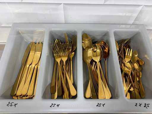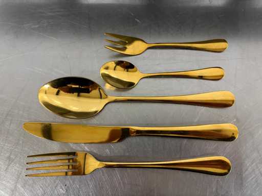 Couverts dorés (couteaux, fourchettes, cuillères, fourchettes à gâteau) (125x)