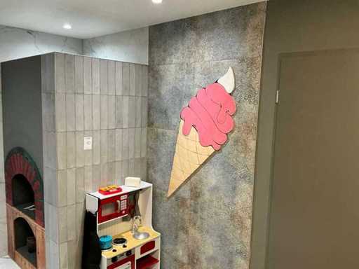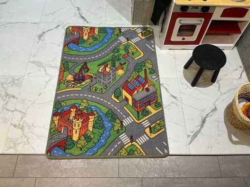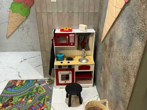 Avec un tapis de jeu, des décorations murales et des accessoires.