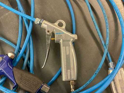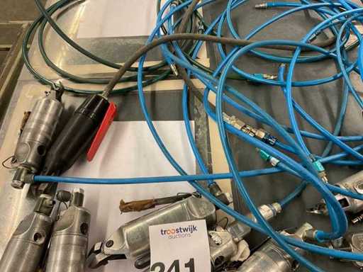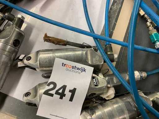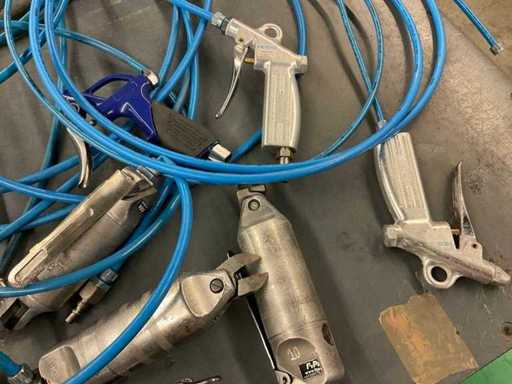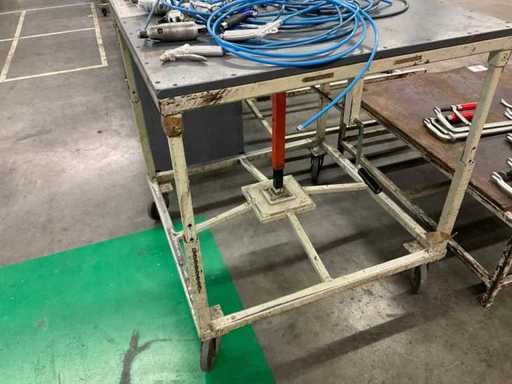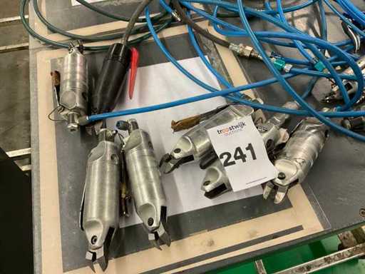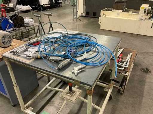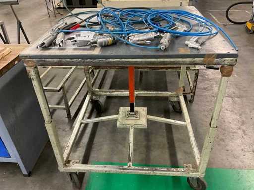 Série d’outils pneumatiques, composée d’environ 10 coupe-fils et d’environ 3 coupe-soufflons, incluant une table de travail à hauteur réglable sur roues, une base métallique et un plan de travail en plastique, dimensions 100 x 100 cm, hauteur réglable à environ 135 cm.