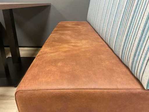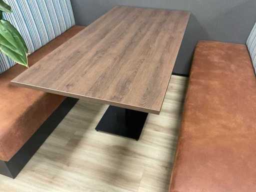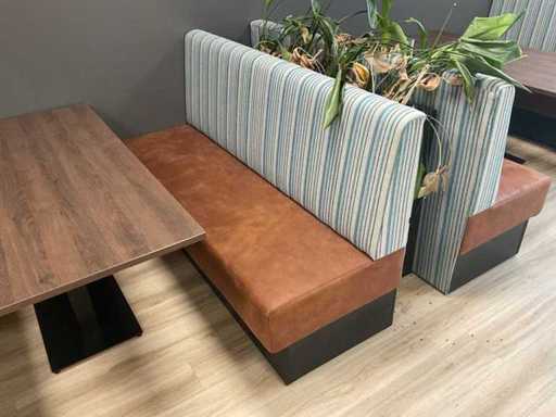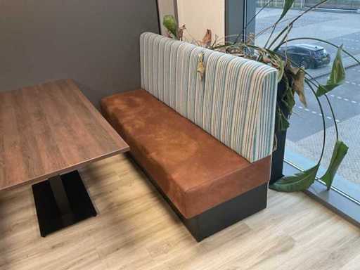 Veuillez noter ! Ce lot fait partie d’une combinaison ; Table (2x) : 80x160x77 cm ; Établis : (4x) 180 cm de large et hauteur du dossier 105 cm ; Siège rembourré en couleur Verotex zulu brun 09 et dossier ; Rembourré en couleur principale Camira Dockland FST 07 ; Banc avec socle fermé de 25 cm de haut, couleur noire ; Porte arrière recouverte de Camir