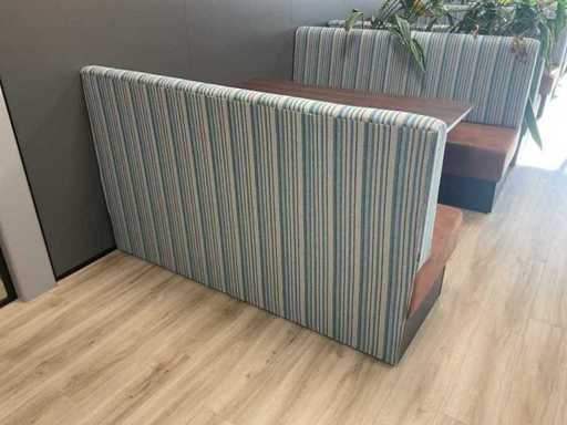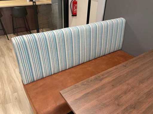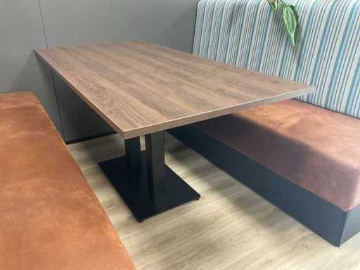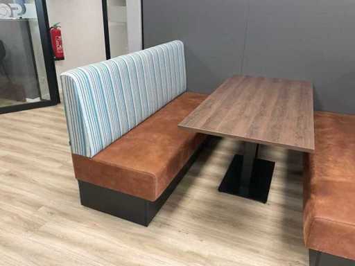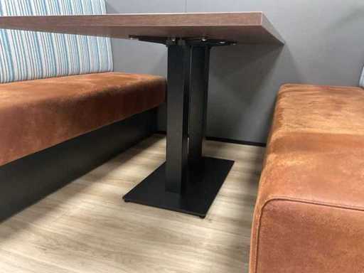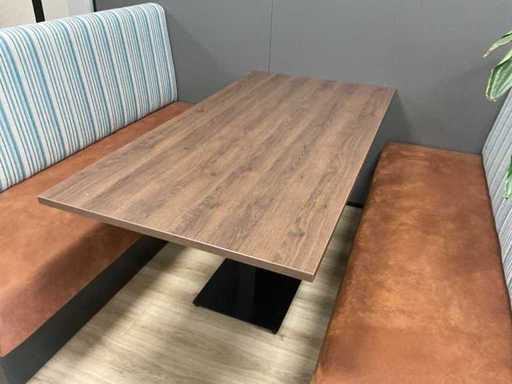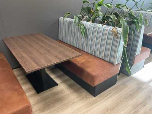 Veuillez noter ! Ce lot fait partie d’une combinaison ; Table (1x) : 80x160x77 cm ; Bancs : (2x) 180 cm de large et hauteur du dossier 105 cm ; Siège rembourré en couleur Verotex zulu brun 09 et dossier ; Rembourré en couleur principale Camira Dockland FST 07 ; Banc avec socle fermé de 25 cm de haut, couleur noire ; Porte arrière recouverte de Camir
