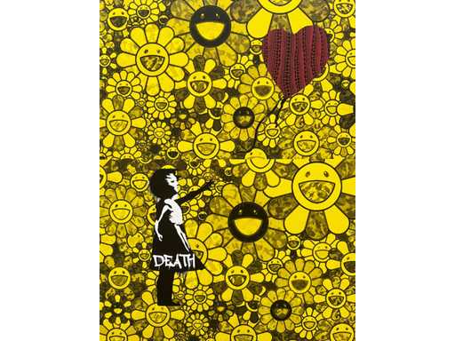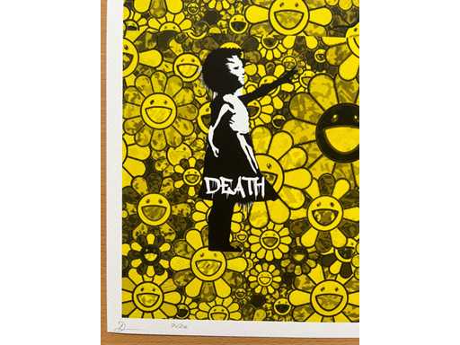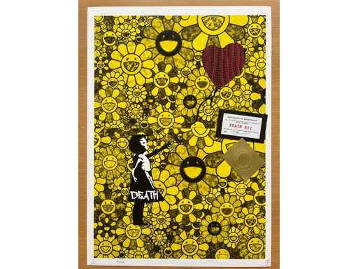 DEATH NYC : Banksy Girl with Balloon & Murakami Flowers