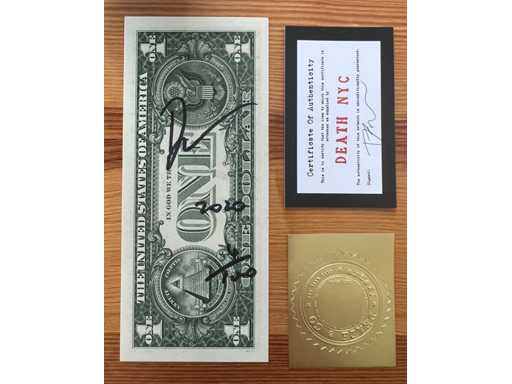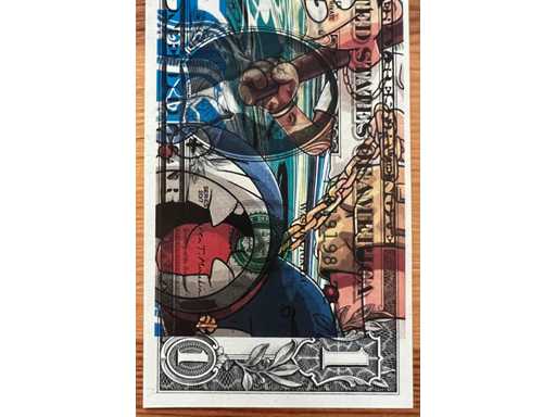 ⹠Oeuvre datée, signée et numérotée à la main. Réalisée sur un vrai dollar US. Format : 15,7 x 6,8 cm. Edition limitée à 100 exemplaires. Certificat d'authenticité et timbre doré à sec de l'artiste