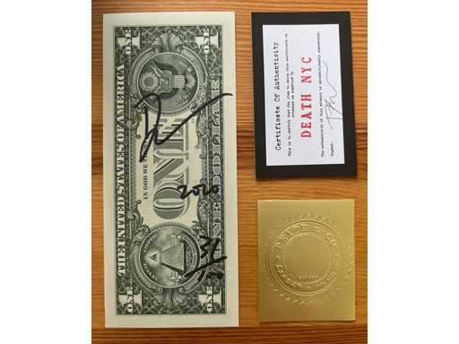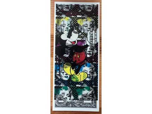 ⹠Oeuvre datée, signée et numérotée à la main. Réalisée sur un vrai dollar US. Format : 15,7 x 6,8 cm. Edition limitée à 100 exemplaires. Certificat d'authenticité et timbre doré à sec de l'artiste