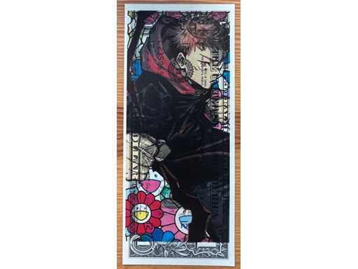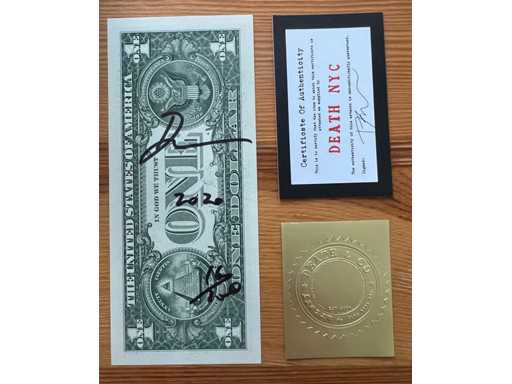 ⹠Oeuvre datée, signée et numérotée à la main. Réalisée sur un vrai dollar US. Format : 15,7 x 6,8 cm. Edition limitée à 100 exemplaires. Certificat d'authenticité et timbre doré à sec de l'artiste