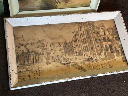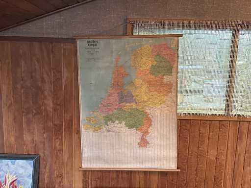 Diverses décorations murales, dont une carte ancienne des Pays-Bas, des peintures sur toile et d’autres gravures.