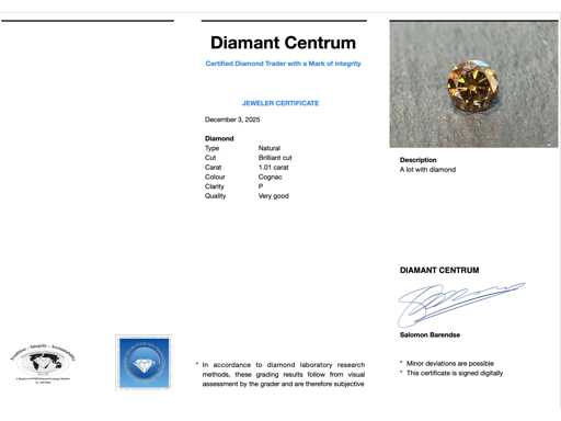 Diamant : Naturel ; Quantité : 1 pièce ; Coupe : Coupe brillante ; Poids (carat) : 1,01 carat ; Couleur : Cognac ; Pureté : P ; Qualité de la coupe : Très jolie ; État : Neuf ; Emballage : Boîte à gemmes ; Explication : La qualité a été prise du rapport correspondant à l’article. L’évaluation est une évaluation d’un négociant certifié en diamants, basée sur les prix à la consommation ; Prix au consommateur : 4 800 €