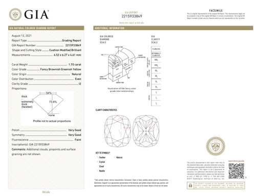 carat Diamant : Naturel ; Quantité : 1 pièce ; Coupe : Coussin modifié brillant ; Poids (carat) : 1,70 carat ; Couleur : Jaune optique fantaisie ; Pureté : Avec des inclusions naturelles ; Certificat : GIA ; Numéro de certificat : 2215933849 ; Informations supplémentaires : Les diamants de couleur fantaisie sont des diamants avec une couleur spéciale et sont très rares. Cela les rend très recherchés et donc très adaptés à des fins d’investissement. Voir certificat GIA pour l’étalonnage des couleurs. État : Neuf ; Emballage : Boîte à gemmes ; Explication : La qualité a été prise du rapport correspondant à l’article. L’évaluation est une évaluation d’un négociant certifié en diamants, basée sur les prix à la consommation ; Prix à la consommation : 15 000 €