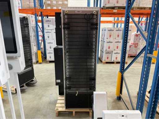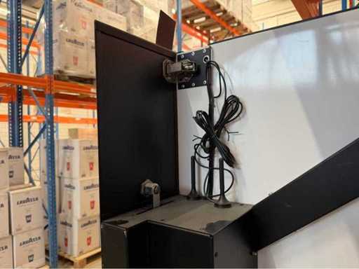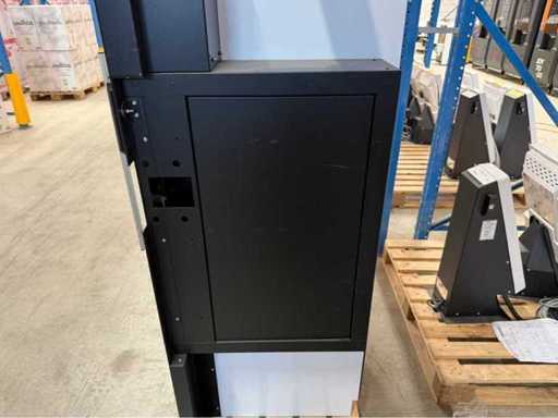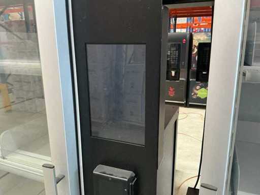Équipé de : écran tactile à choix, terminal de paiement, réfrigérateur et congélateur avec serrure magnétique. Taille totale : 60x140x185 cm.