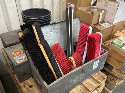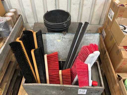 Composé de : 5 balais durs d’extérieur ; 5 balais intérieurs souples ; 5 seaux noirs 12L ; 2x tracteur ; tous sans poignées ; des bacs incluf, sans palettes ;