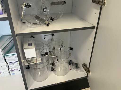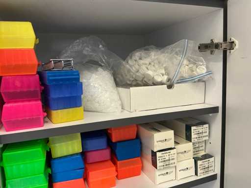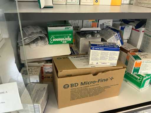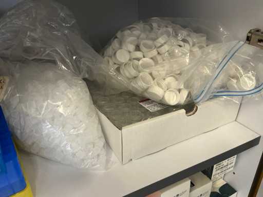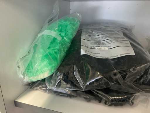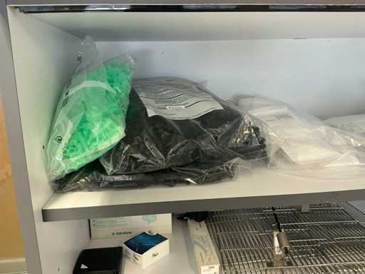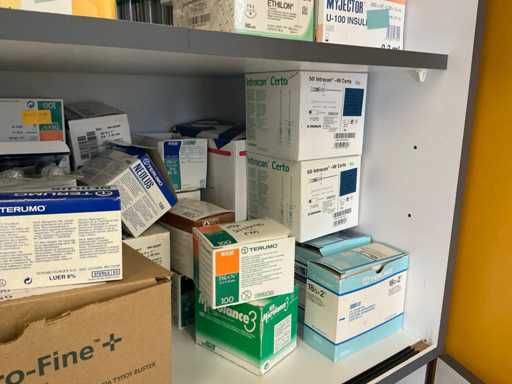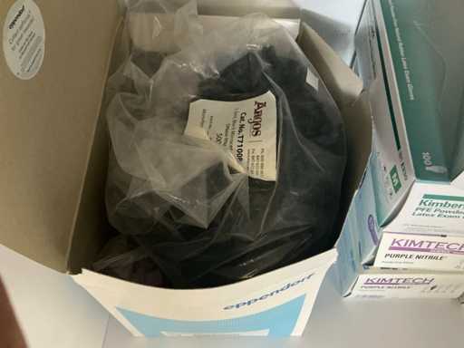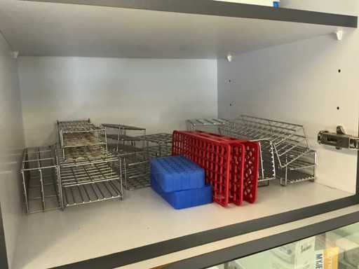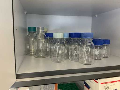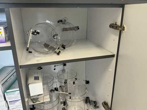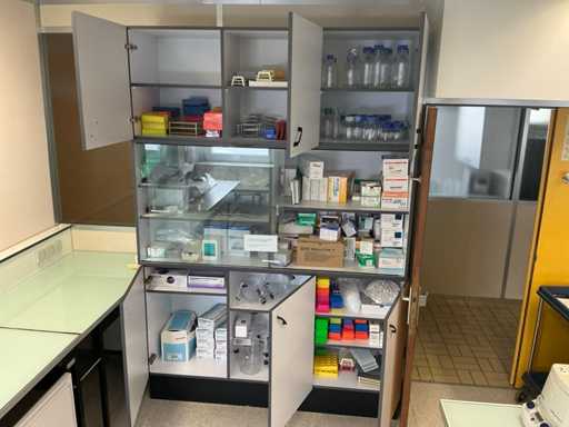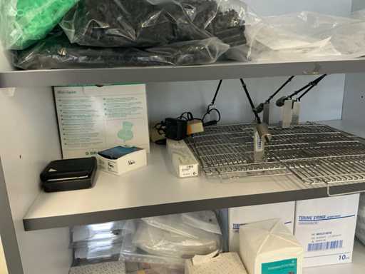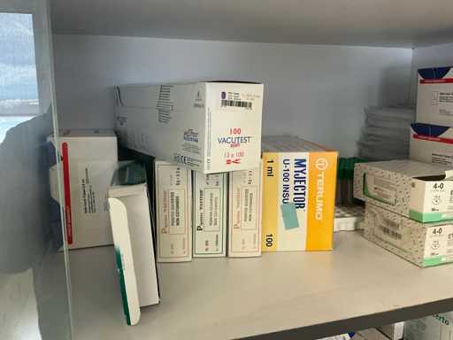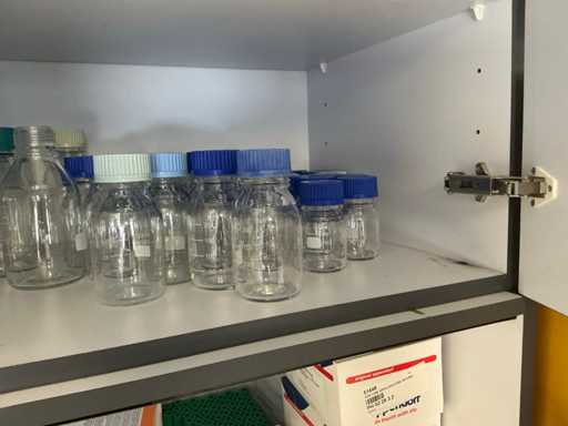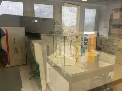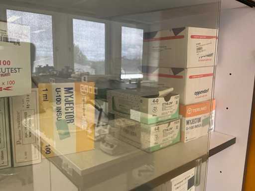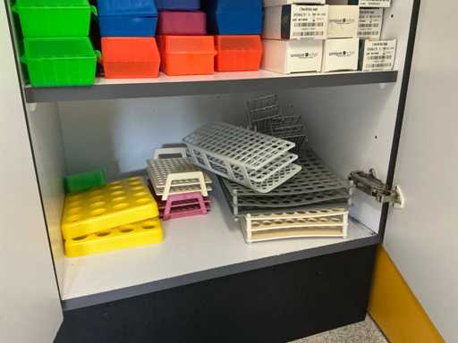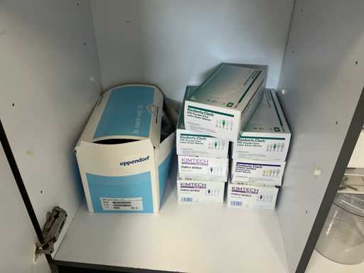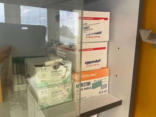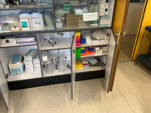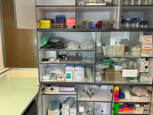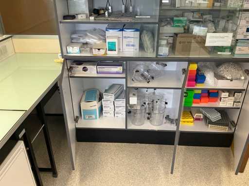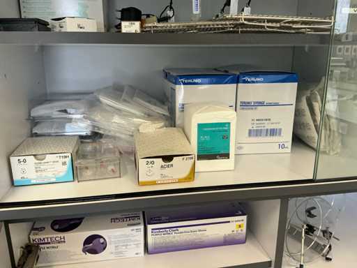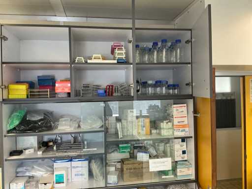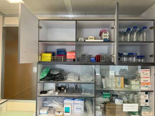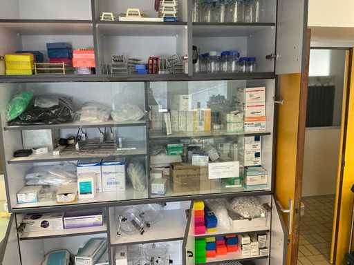 Avec entre autres : porte tubes à essai, verrerie, gants, capuchons, compresses, flacons…