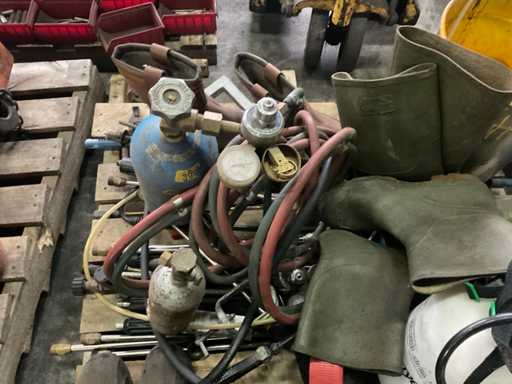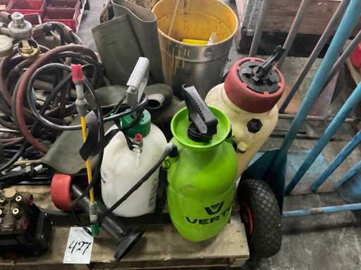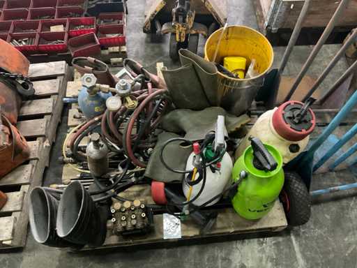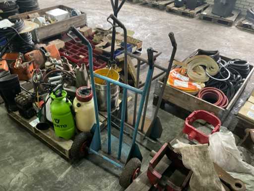 Y compris 2 chariots à main (1 sans roues), bloc de distribution hydroélectrique, bouteille d’oxygène, pulvérisateurs manuels, lances pulvérisatrices, etc. Sur et y compris la palette.