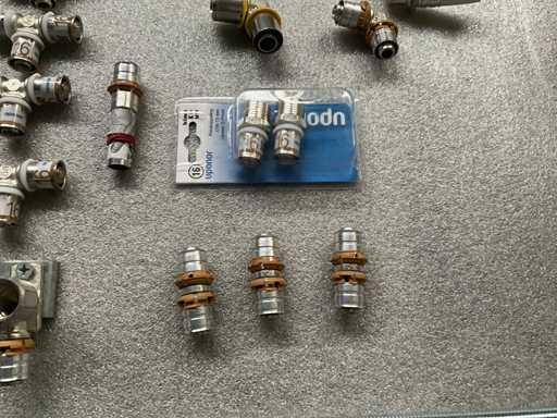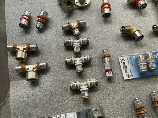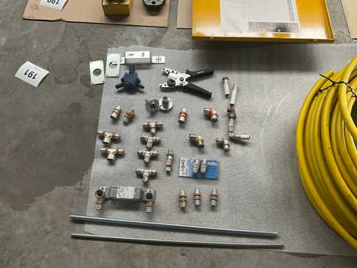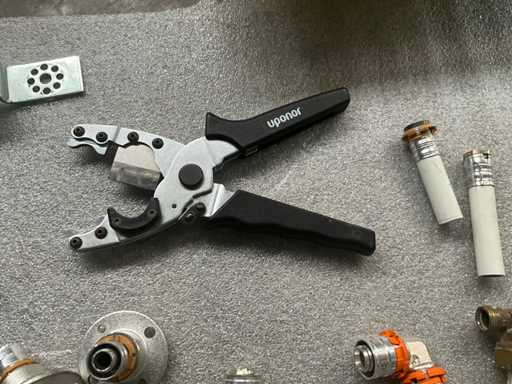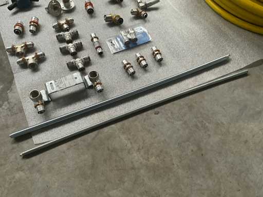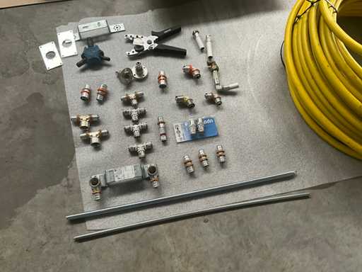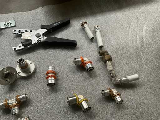 Tuyaux de tuyauterie sous pression dont 1 pour l’Uponor à gaz env. 60 lpm) jaune et 1 pour l’Uponor à eau (env. 80 lpm), pour les spécifications - voir photos et complet avec divers accouplements et pinces d’ébavurage, 2 ressorts à meule et accessoires.