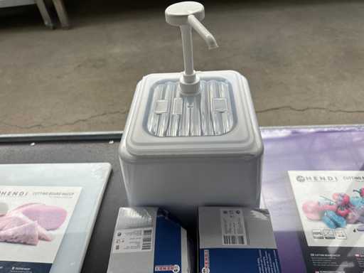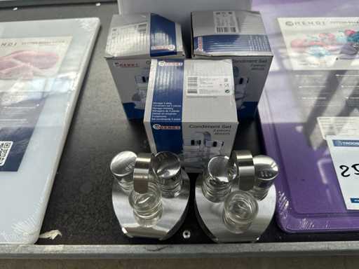 Il se compose de cinq ensembles de sel et de poivre, d’une planche à découper en polyéthylène et d’un distributeur de sauce