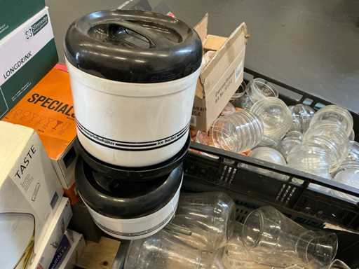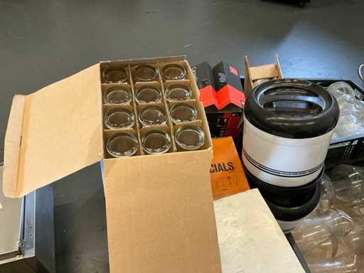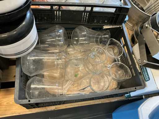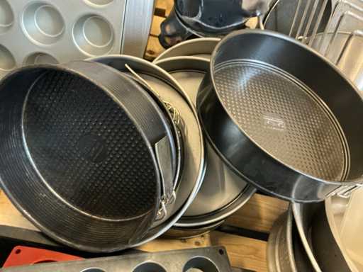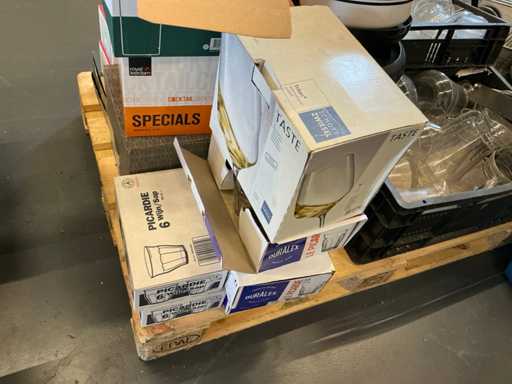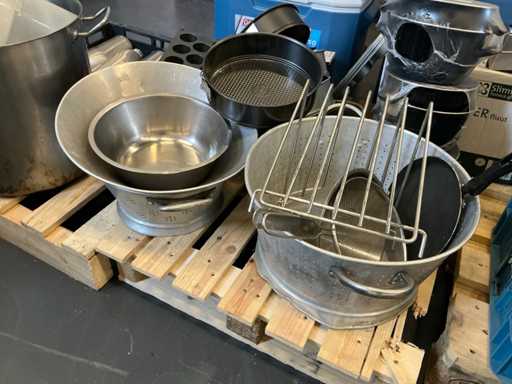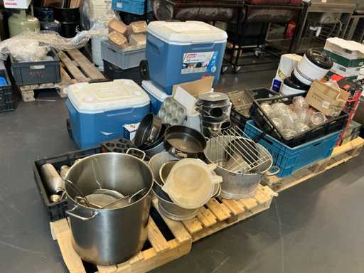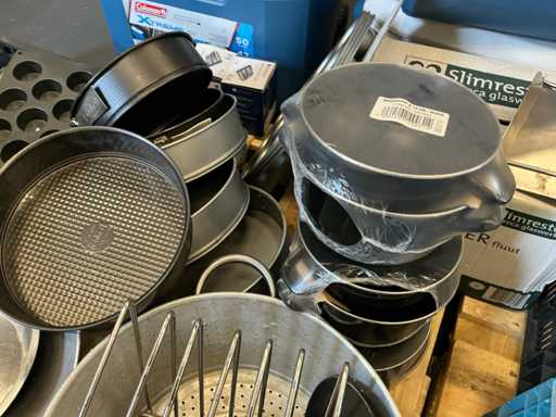 Diverses poêles, ustensiles de cuisson, verrerie, cruches, etc.