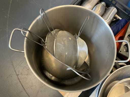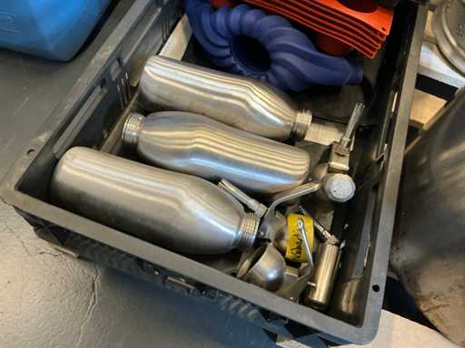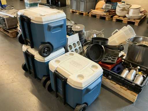 Equipé de : diverses poêles de restauration, poêles à moules, plateaux à frites, seringues de crème fouettée, glacières, ustensiles de cuisson, verrerie, bouteilles, ustensiles de cuisine, porte-serviettes, porte-cartes de menu