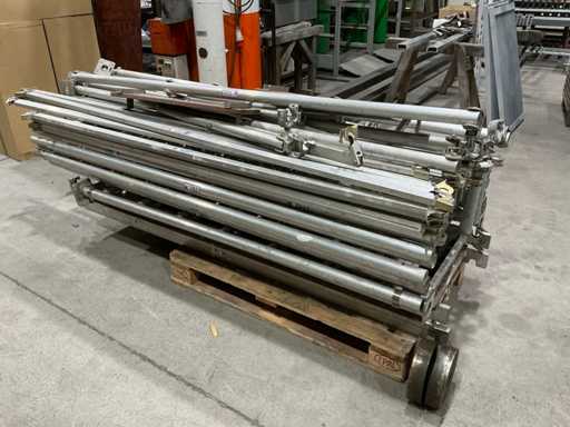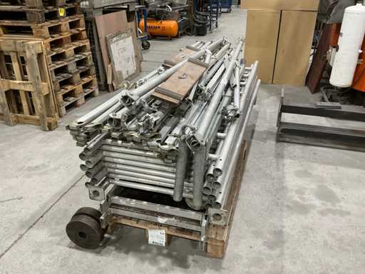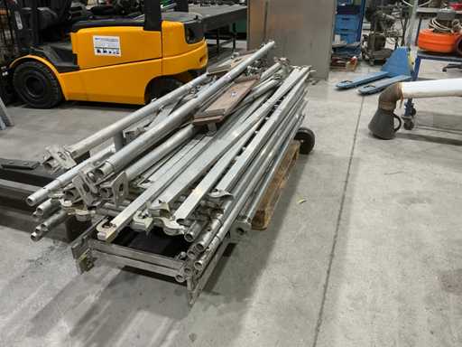 Composé de : 2x planchers (2000x600 mm), 2x repose-pieds (1750x750 mm), 5x supports latéraux (2000x750 mm), 2x supports latéraux (1000x750 mm), 8x jambes de force diagonaux, 2x jambes de force horizontales, 4x éléments de rampe, 4x supports latéraux, 2x extension de châssis (1700 mm), 4x roues, 2x protection contre les chutes, 12x bagues de lest