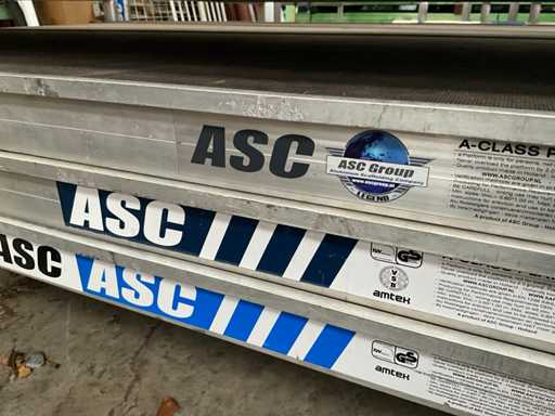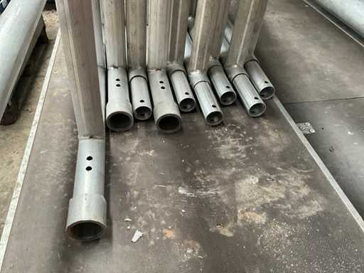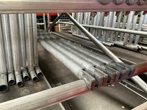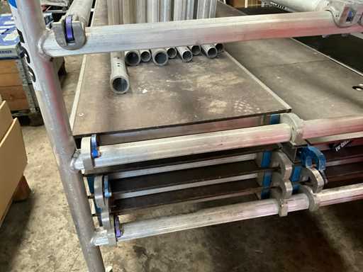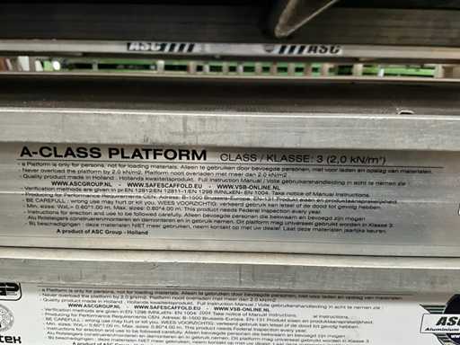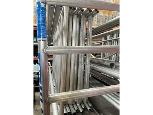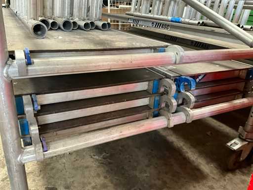 Quai de classe A d’environ 300 x 130 cm, avec une hauteur de travail de 12 mètres, composée de 12 montants et fixations variés de 130 cm, 7 passerelles en aluminium/plastique, dont 3 avec trappes, chacune de 3 mètres de long et 60 cm de large, diagonaises assorties et accessoires (complets).
