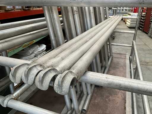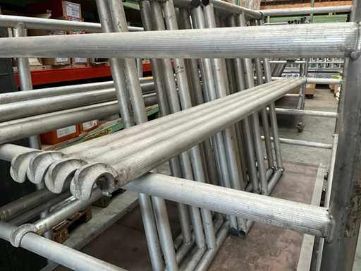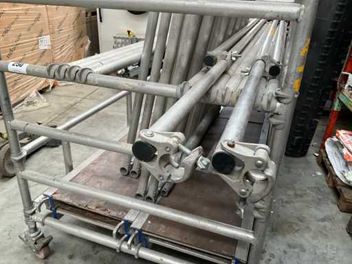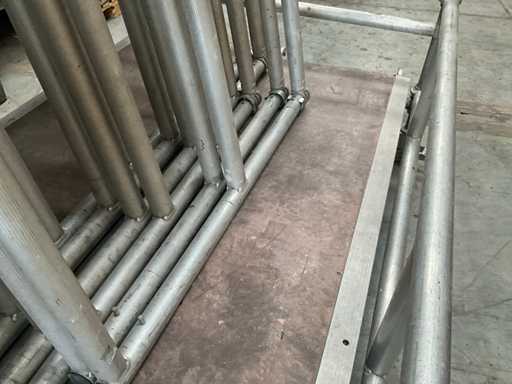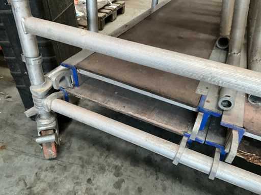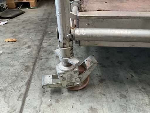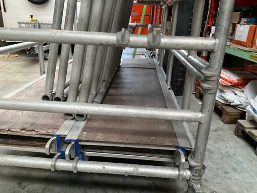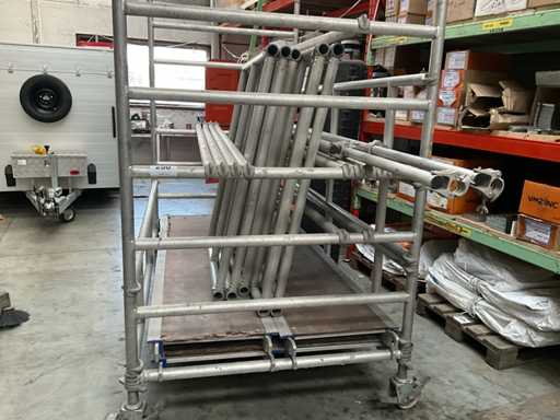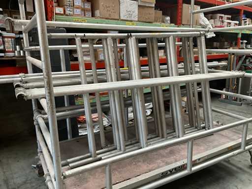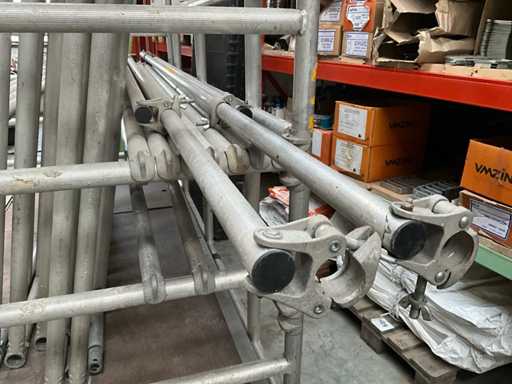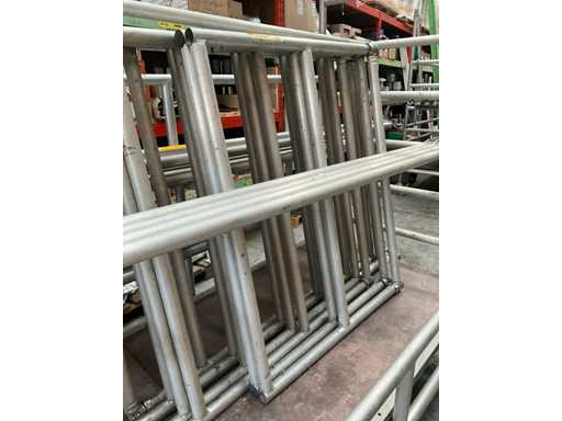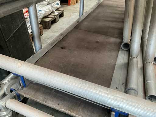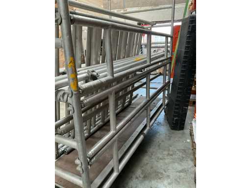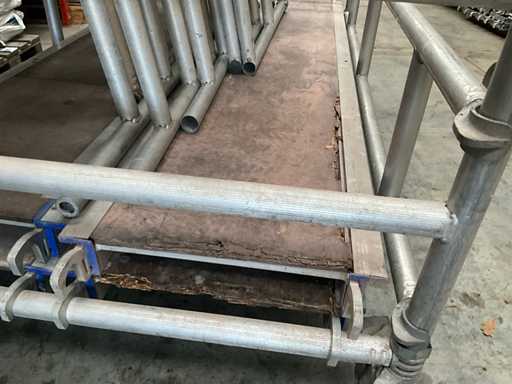 Plateforme d’environ 250 x 130 cm, avec une hauteur de travail de 7,5 mètres, composée de 8 éléments verticaux/constructions variés de 130 cm, 4 passerelles en aluminium/plastique, dont 2 avec trappes, chacune de 2,5 mètres de long et 60 cm de large, ainsi que des diagonales et accessoires associés.