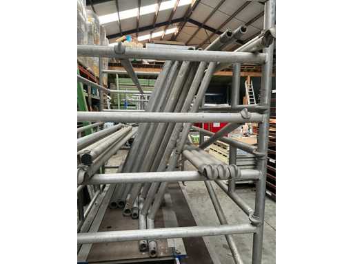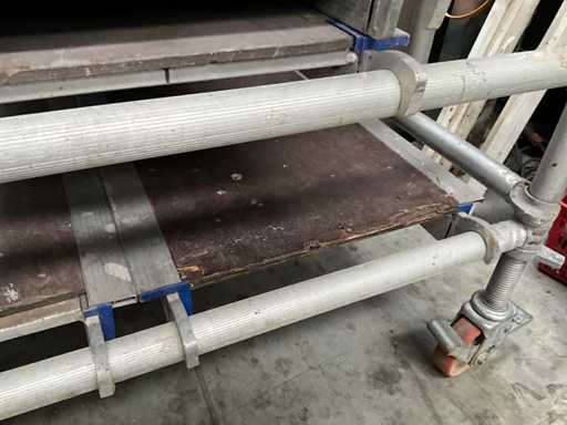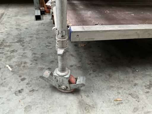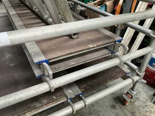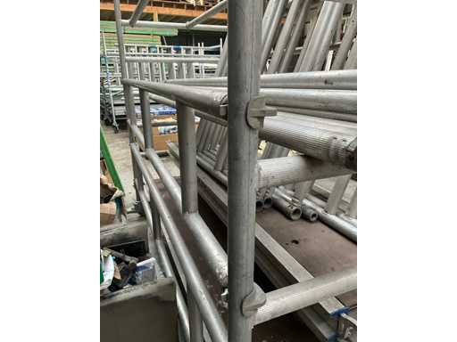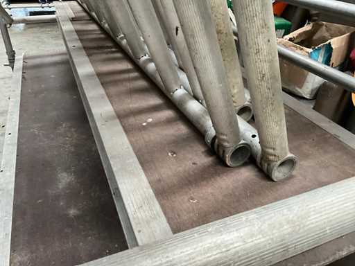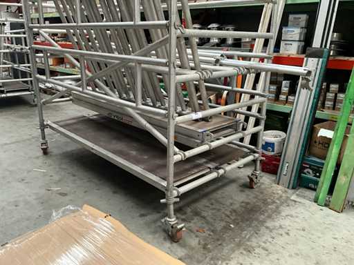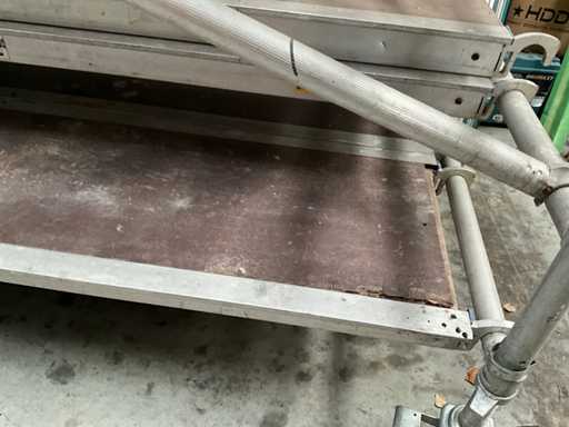 Plateforme d’environ 250 x 130 cm, avec une hauteur de travail de 7,5 mètres, composée de 8 éléments verticaux/constructions variés de 130 cm, 4 passerelles en alu/plastique, dont 2 avec trappes, chacune de 2,5 mètres de long et 60 cm de large, diagonaises et accessoires correspondants (complets).