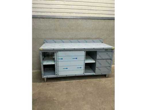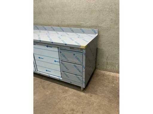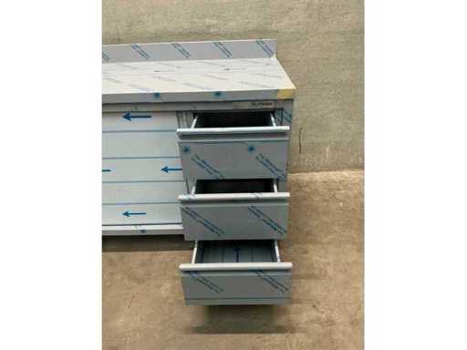 Table de travail en acier inoxydable avec bord surélevé, 3 tiroirs, 2 portes coulissantes et 1 étagère réglable en hauteur