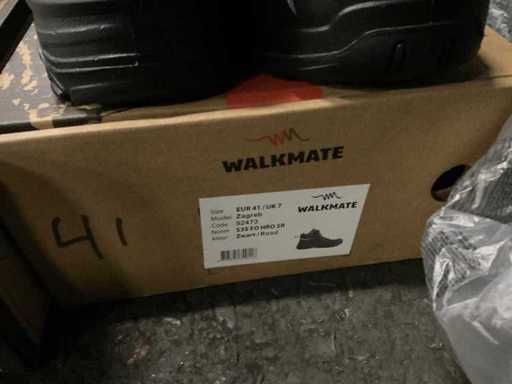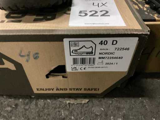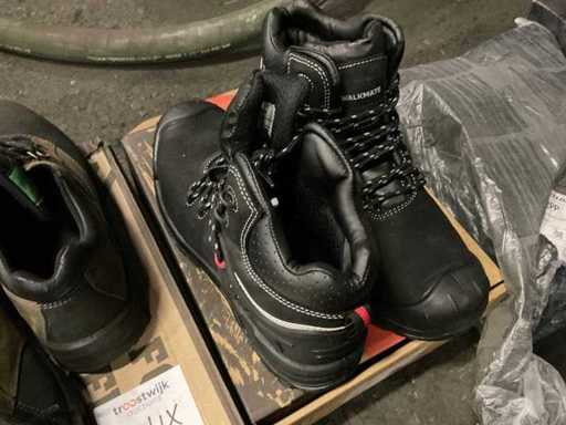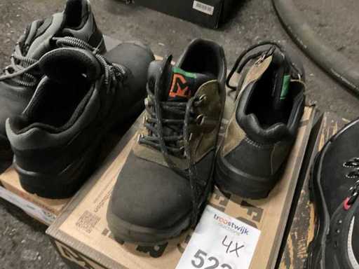 4 paires de chaussures de travail composées de 2 paires de modèles bas taille 39 et 40, modèles haut 41 et 42 et 1 paire de bottes Dunlop taille 42 avec bouts protecteurs.