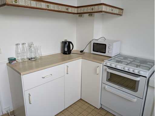 Table murale, chaise, poubelle, meuble de cuisine, gazinière, micro-ondes & bouilloire