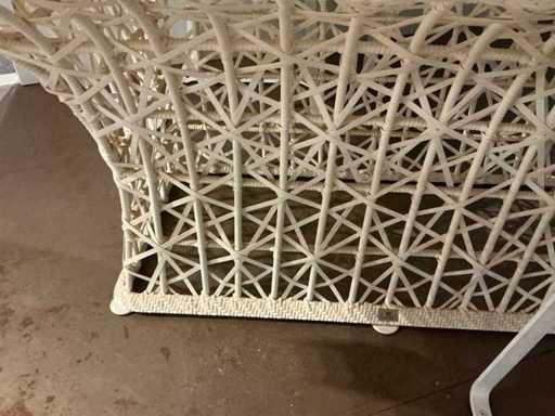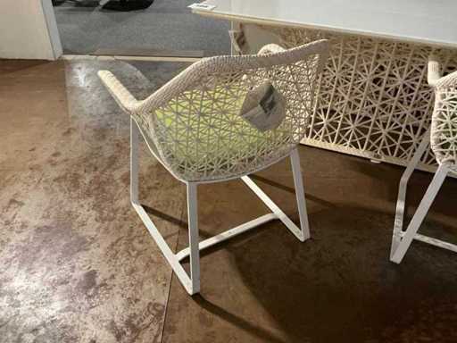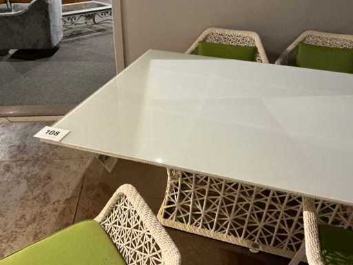 Composé d’une table avec structure tressée en PVC et plateau en verre de 180x120 cm, ainsi que de 4 chaises tressées en PVC avec base métallique