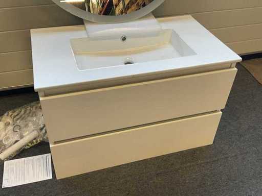 Composé de : 1x évier avec trou de robinet et trop-plein, L81xL 46cm, 1x meuble de base avec 2x tiroir à fermeture douce, 1x miroir avec éclairage + chauffage, D=80cm et 1x siphon Viega.