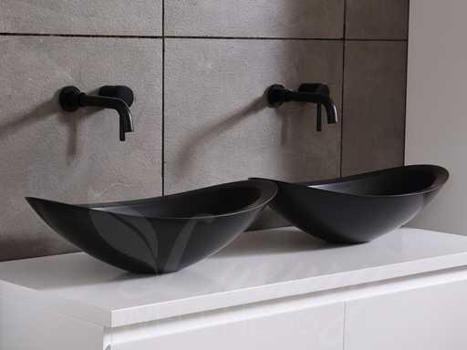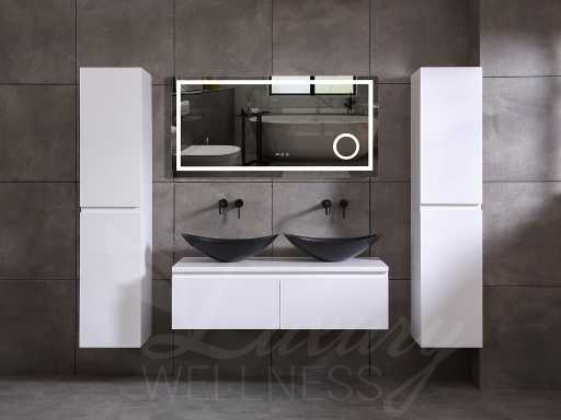 Dimensions du meuble : choix : 2 tailles : LXDXH 150x50x35cm ou 180x50x35cm (largeur choisie, merci de le transmettre le jour du ramassage - meuble mural 35x35x160cm (1 inclus), couleur blanche mate, contreplaqué en matériau 5 couches avec dessus en chêne de 3cm (très résistant et résistant à l’humidité), placard mural, portes à fermeture douce et étagères supplémentaires (meuble mural peut être suspendu à gauche comme à droite du meuble), Exclusivité des robinets, tiroirs 2 pièces avec fermeture douce, Sinks surface solide, pierre naturelle ou marbre italien (choix de différents modèles sur les 3 dernières photos, veuillez envoyer votre choix par email sur info@mawialux.nl), miroir avec chauffage/horloge/température et loupe avec éclairage LED avec 3 couleurs réglables LED 3000/4500/6000K (lumière jaune/bleue/blanche) avec les options suivantes : affichage numérique, miroir loupe intégré de 10 cm de diamètre avec éclairage LED (agrandi 3x), Horloge numérique, indicateur de température numérique, prise 220 volts (plug and play), chauffage pour éviter la condensation, 1,5 mm sans cuivre avec couche anti-explosion avec la même fonction que le verre trempé, exclusivité pour les drains, État : neuf dans la boîte, Avantages spéciaux garantie 2 ans, les trous ne sont pas pré-percés sur le dessus donc vous pouvez utiliser à la fois des robinets muraux et des robinets du dessus ou même un seul évier au lieu de deux pièces (percer des trous par un installateur est facile à faire soi-même), Avec un matériel d’installation de très haute qualité, à noter ! L’armoire murale peut être échangée contre un jeu de robinets et de drains à pop-up de votre choix ou, si vous avez besoin d’une meuble murale supplémentaire, veuillez indiquer le jour de la collecte une offre appropriée
