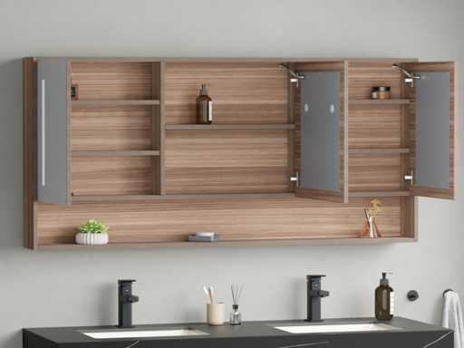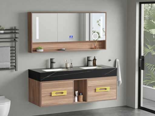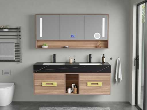 Type : MBY-315. Dimensions : décor 2 personnes : 1* Unité de vanité - 1500x550x550mm, 1* Miroir - environ 1500x700mm. Équipé de : Système de tiroirs à fermeture douce : 4 tiroirs - Robinets incluant un drain escamotable - Miroir avec éclairage LED tactile et technologie anti-buée - Mobilier de lavabo préassemblé.