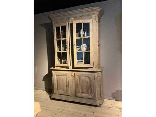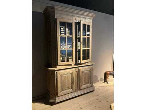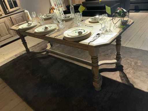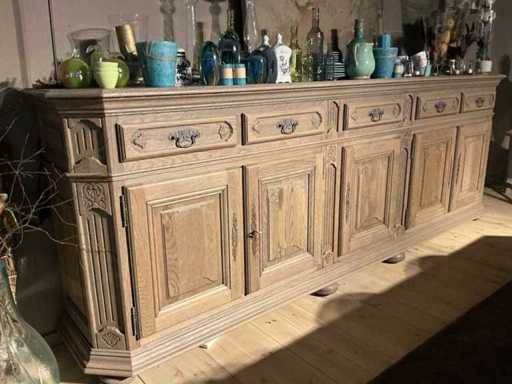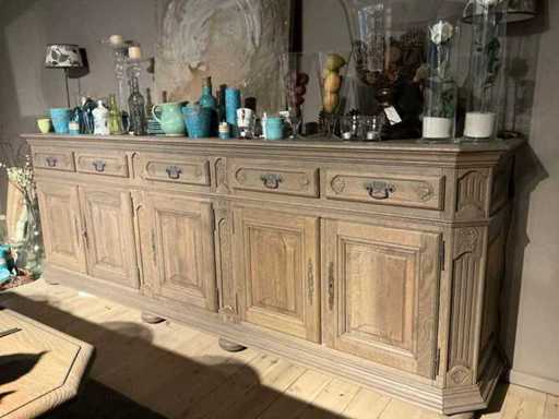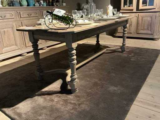 Composé d’une table à manger d’environ 220 x 90 x 76 cm, d’une vitrine d’environ 150 x 52 x 217 cm avec 4 portes dont 2 verres, d’un buffet d’environ 300 x 54 x 110 cm avec 5 portes et 5 tiroirs, hors contenu et lots numérotés.